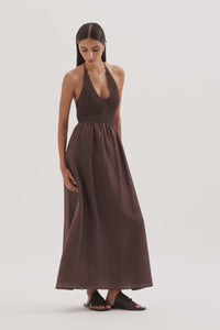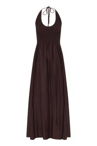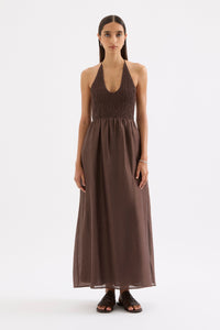 The Aliki Maxi Dress is made from a slightly sheer lyocell blend fabrication with a smooth hand feel. This maxi length dress has a fit and flare silhouette and features a halter neck, scoop neckline, shirred bodice, soft gathering through skirt and tie at back neck. This dress is fully lined.