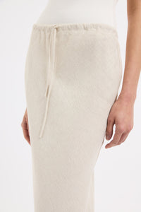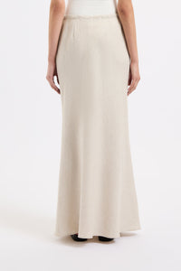 The Amani Linen Skirt in natural is made from a premium linen which has been washed for a smooth, soft hand feel. Cut on the bias, this silhouette finishes just above the ankles. Features include encased elasticated waistband with a self cut draw string at centre front.