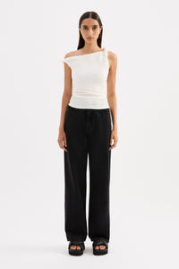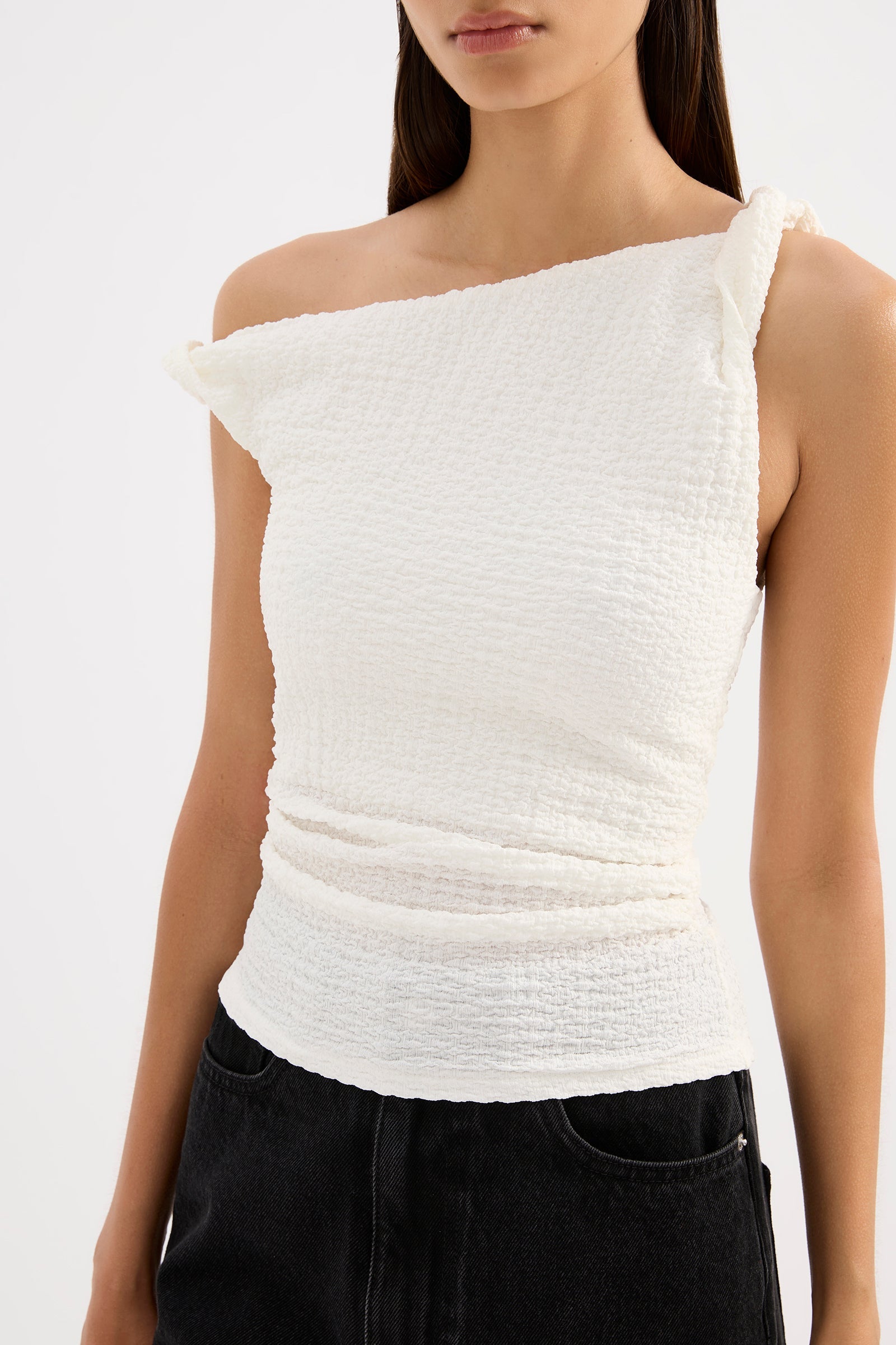 The Apollo Top is made from a stretch bubble texture fabrication that has a soft, dry hand feel. The silhouette is a flattering close fit and finishes above the hips. Features include an asymmetric neckline, with a twist straps and soft gathers through the waist. This top is fully lined.