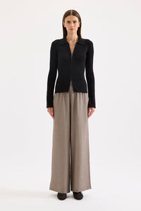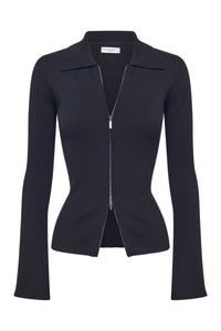 The Betina Zip Front Knit is made from a cotton blend yarn which has a ribbed, soft hand feel. The silhouette is fitted to the body with long, flared sleeves and length finishing above the hips. Features include knitted collar and a branded double ended zipper at centre front.