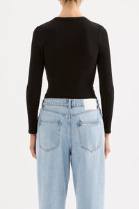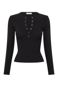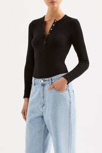 The Binx Long Sleeve Top is made in an organic cotton which has a high stretch and ribbed effect. The silhouette is a flattering close fit with a crew neckline and length finishing at the hips. Features include long fitted sleeves, snap button closure. This can be tucked in or worn over midrise bottoms.