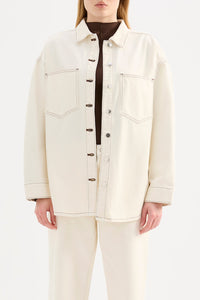 The Bryden Denim Jacket is made from 12.5 oz 100% organic cotton denim, stone washed to Natural. The silhouette is oversized with a drop shoulder and length finishing below the hips. Features include front patch pockets & branded shank button through centre and sleeve cuff.