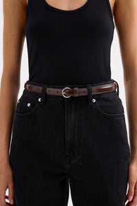 Our Carmen Leather Belt is a slim, structured style crafted from polished leather. It features two leather keepers, a shiny silver round metal buckle, and five buckle holes for an adjustable fit. The belt is finished with self-stitched edges for a clean, elevated look.