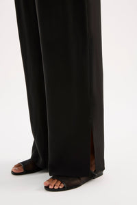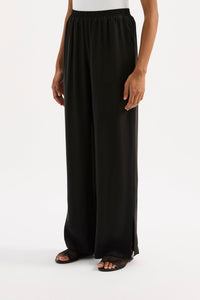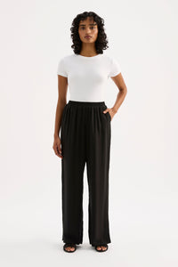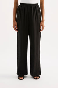 The Dara Cupro Pant in pickle is made in our signature cupro fabrication which has a soft, sueded hand feel. The silhouette is a relaxed wide leg, full length pant. Features include an elasticated waistband, side seam pockets and slits at hem.
