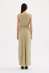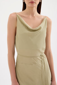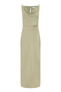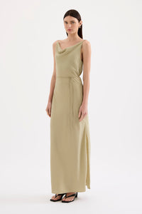 The Elio Maxi Dress is crafted from a lightweight and drapey viscose blend fabrication with a subtle crinkled texture. Cut on the bias, this maxi length dress features a flattering cowl neckline, tie at waist and side seam slits.