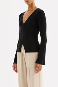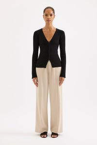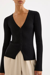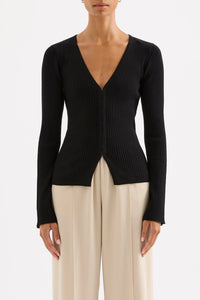 The Ettiene Knit Cardigan is made from a cotton blend yarn which has a ribbed, soft hand feel. The silhouette is fitted to the body with long, flared sleeves and length finishing above the hips. Features include V-neck and hook and eye opening at centre front.