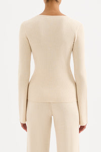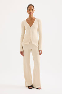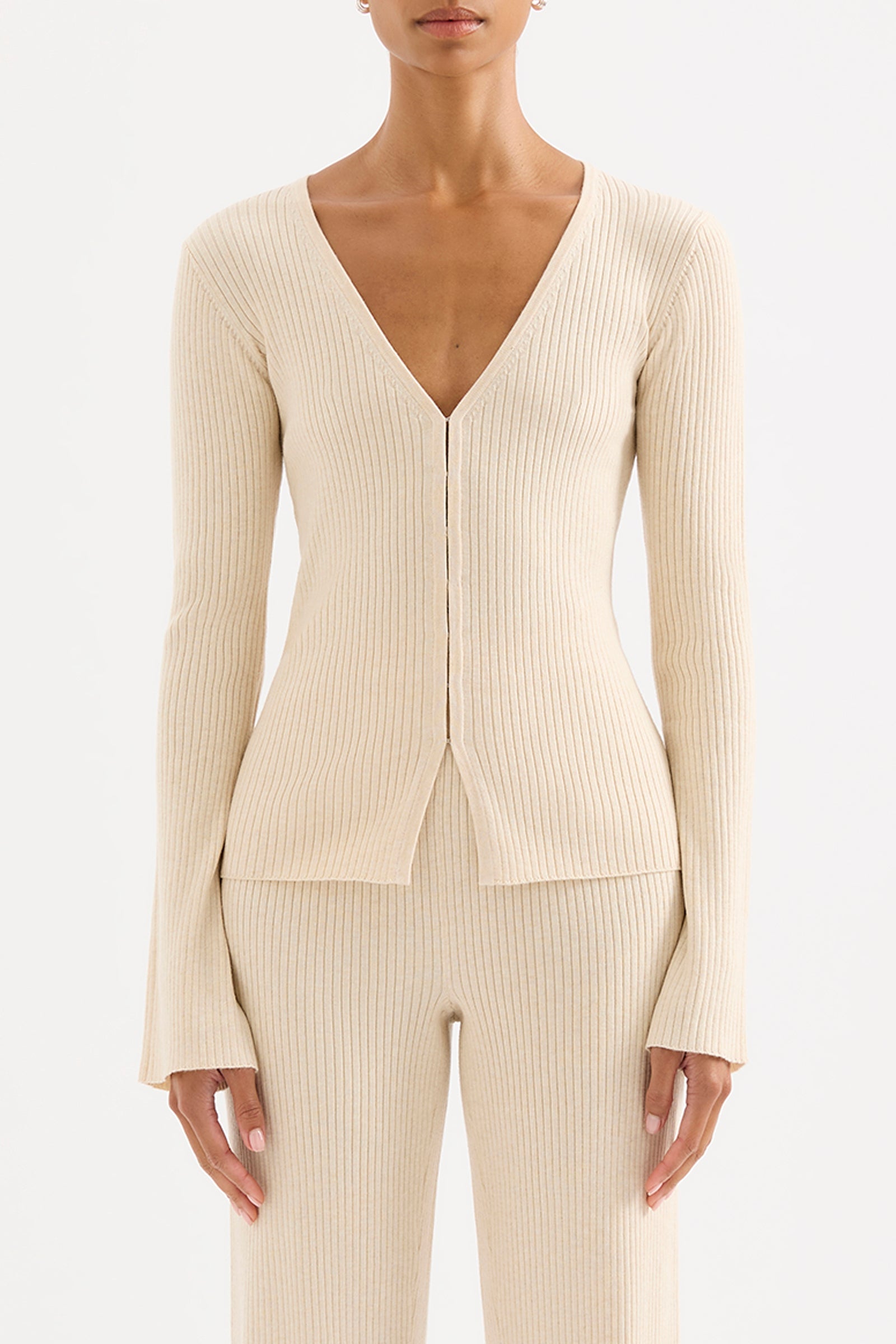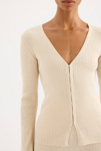 The Ettiene Knit Cardigan is made from a cotton blend yarn which has a ribbed, soft hand feel. The silhouette is fitted to the body with long, flared sleeves and length finishing above the hips. Features include V-neck and hook and eye opening at centre front.