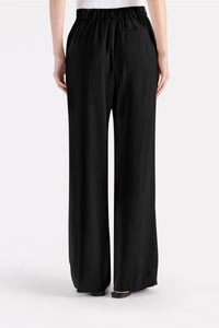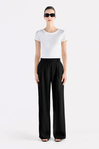 The Everyday Tailored Pant is made from a classic suiting fabrication with a smooth hand feel. The silhouette is a tailored fit with a high rise waist and wide leg. Features include front pleats at waist, internal elastic at back waistband & concealed button and trouser hook closure.