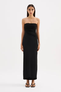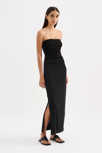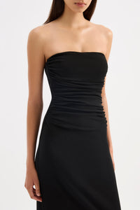 The Fiora Mesh Maxi Dress is made from a stretch jersey with a dry hand feel. The silhouette is form fitting with length finishing above the ankles. Features include a strapless neckline with grip tape, and soft gathering starting at the bust and continuing through the waist. This dress is fully lined.