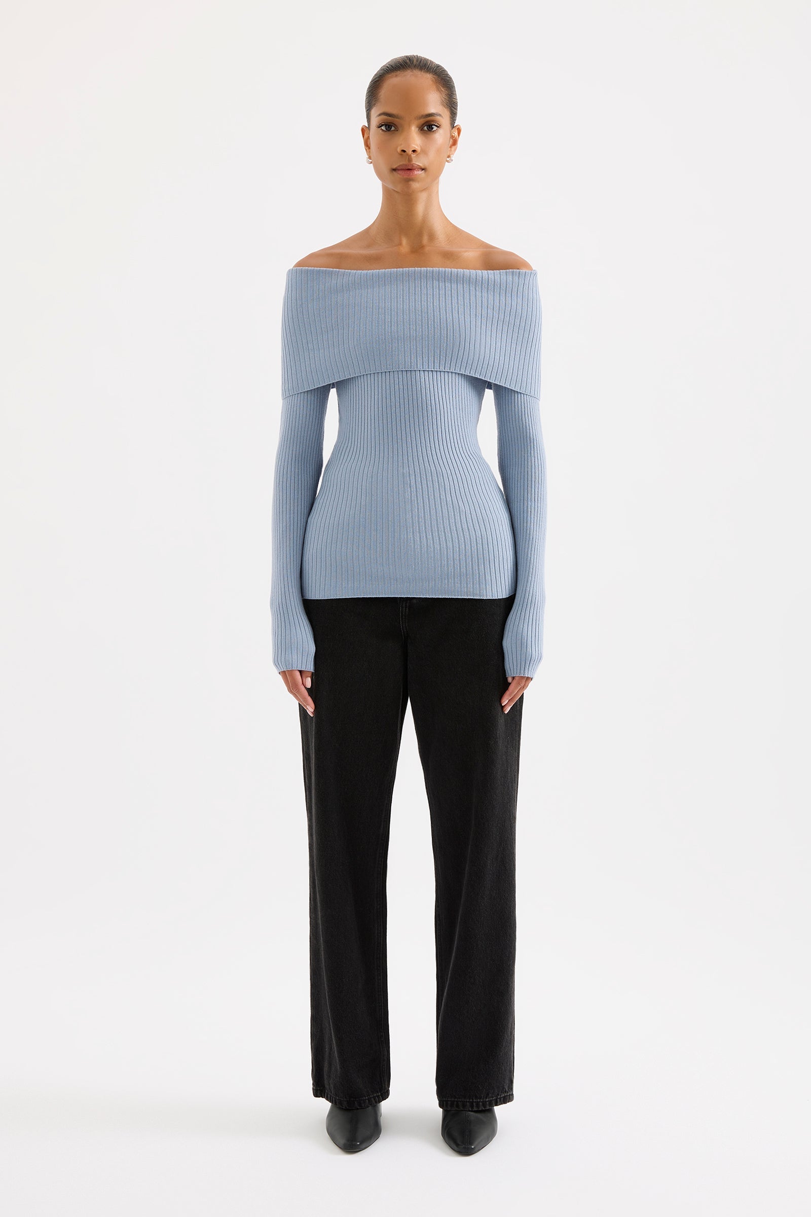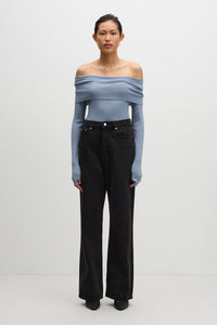 The Krishna Off Shoulder Knit is made from a lightweight cotton blend yarn which is soft on the skin. Silhouette is slim fitting with full length sleeves and length finishing just above the ankles. Features include a foldover off shoulder neckline, thumbholes and a classic rib pattern construction.