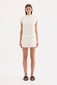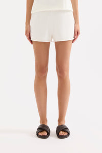 The Landa Knit Short is made from a cotton yarn with an extra soft hand feel. The silhouette is worn high on the waist and is mini in length with a wide leg opening. Features include an encased elasticated waistband and a roll hem finish.