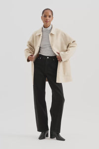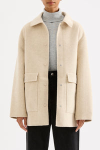 The Levi Wool Coat is made from a classic thick wool blend fabrication which has a soft, warm hand feel. The silhouette is relaxed with a dropped shoulder and length finishing below the hips. Features include front patch pockets and metal snap opening.