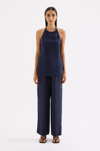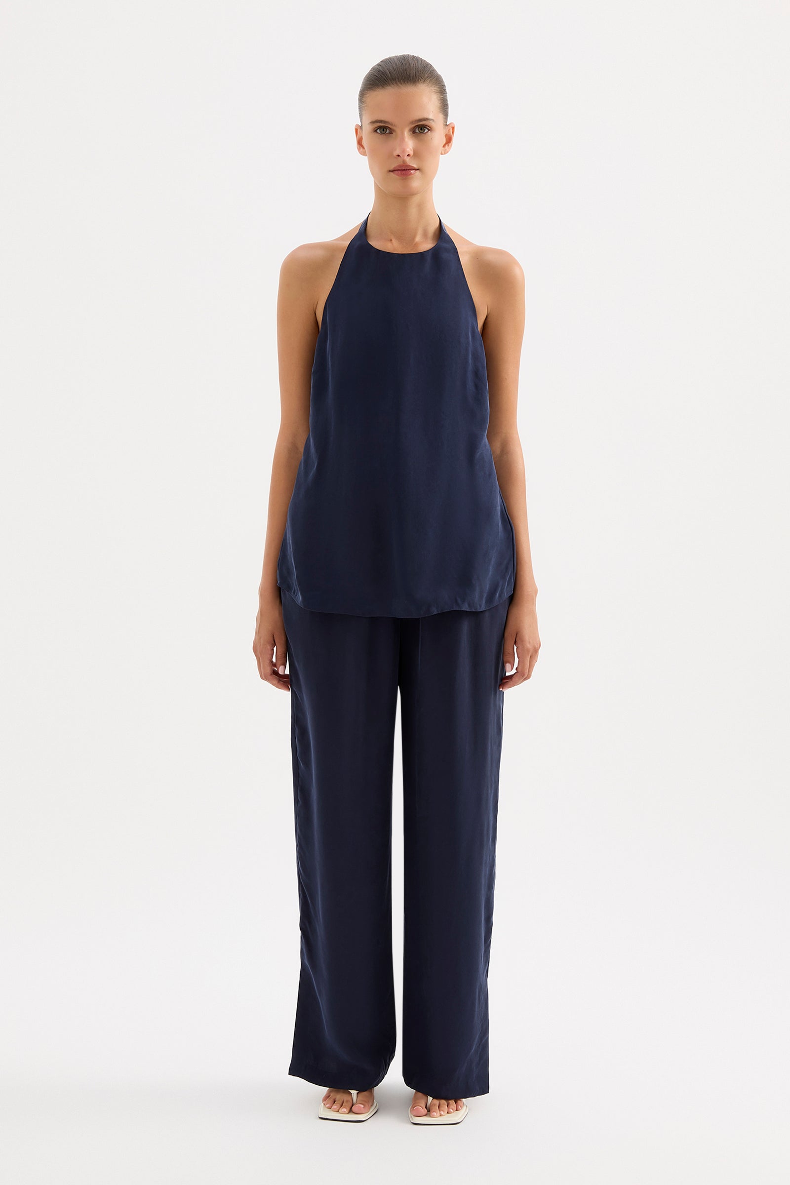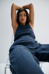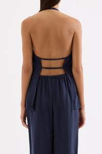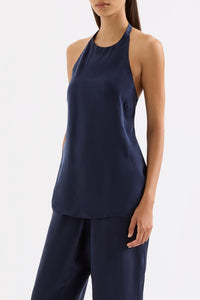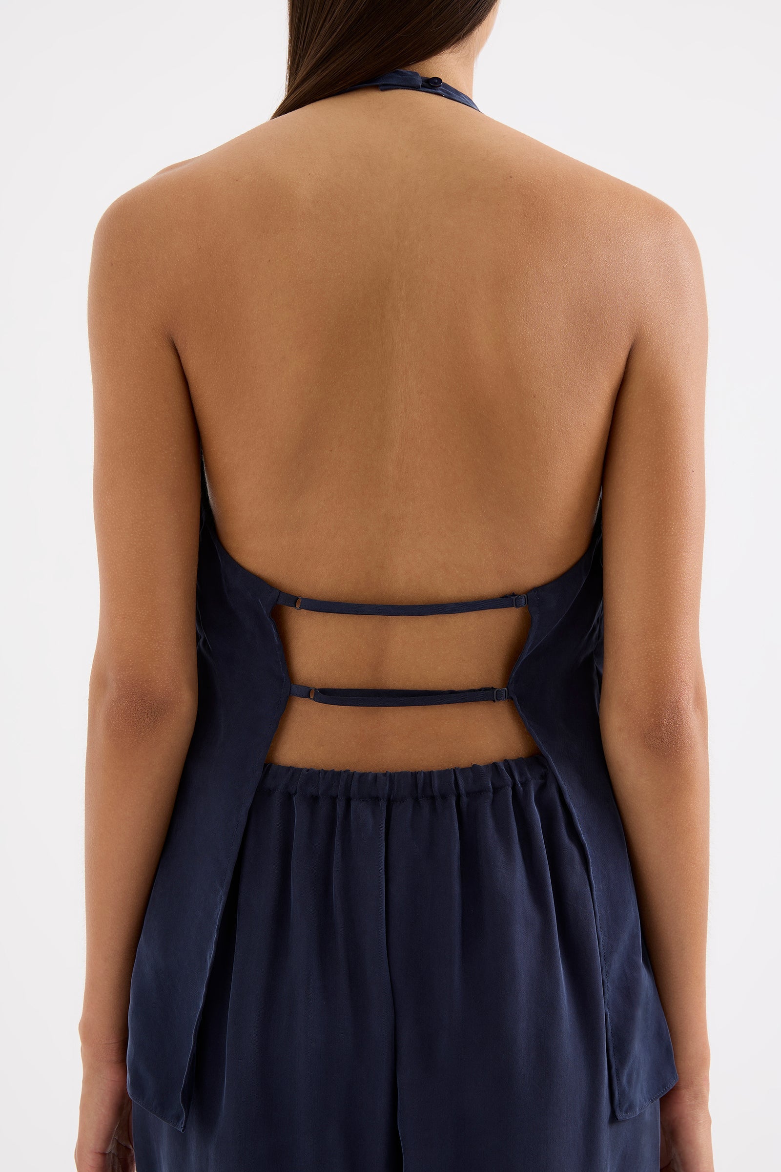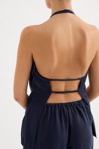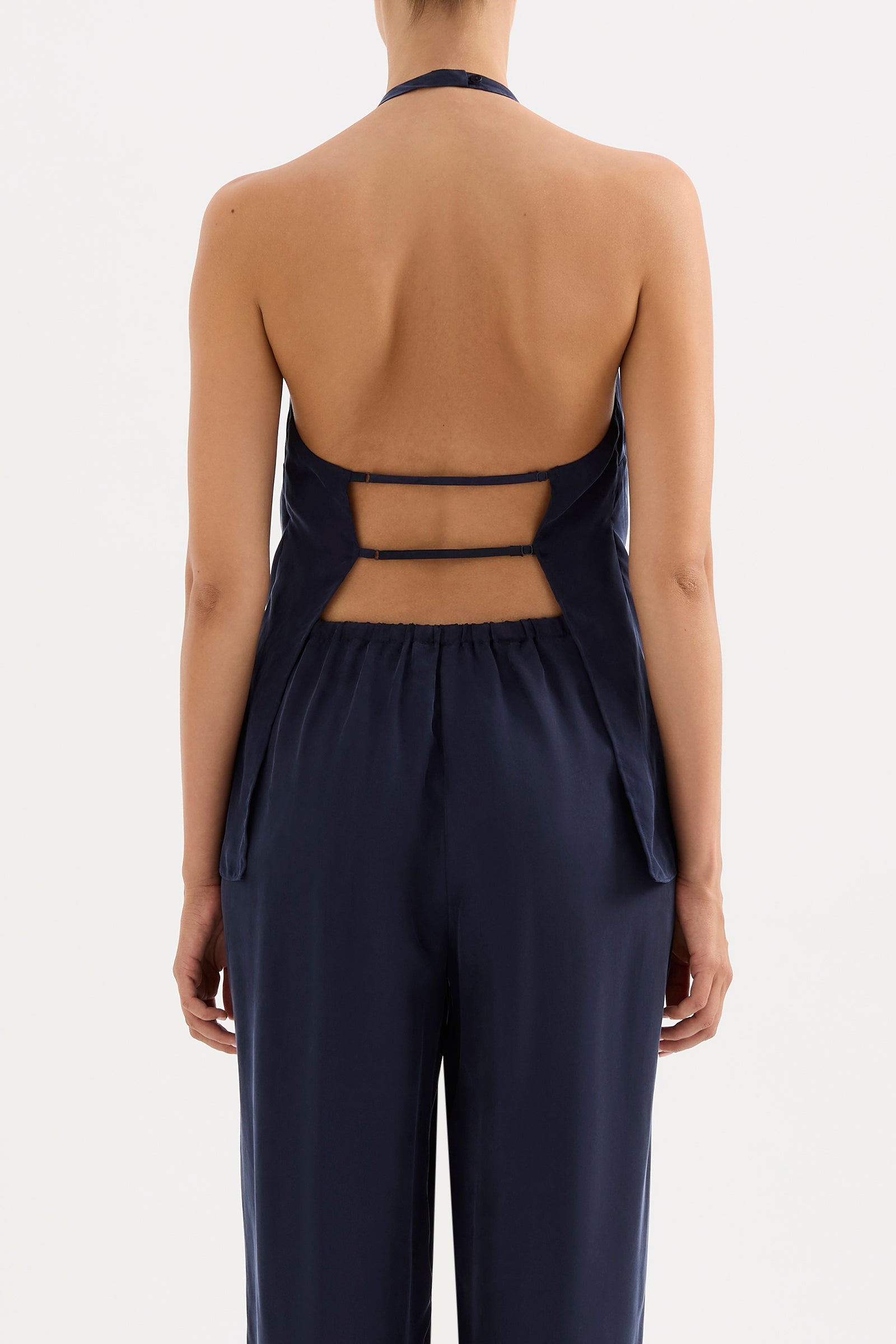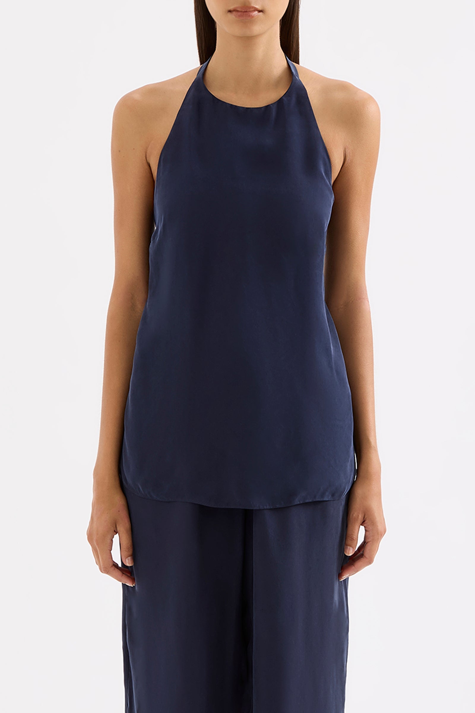 The Linnea Cupro Top is made in our signature cupro fabrication which has a soft, sueded hand feel. The silhouette is a halter neck with an open back. Features include thin adjustable straps at back and concealed button closure at back neck.
