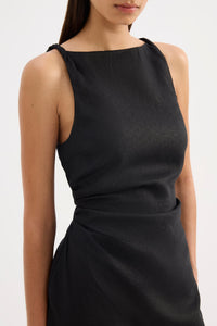 The Lotta Linen Mini Dress is made from a breathable 100% linen that has a soft hand feel. This silhouette is slim fit with an A-line mini skirt. Features wide boat neck with twist detail straps, gathers through waist create a flattering fit and invisible zipper at back. This dress is fully lined.