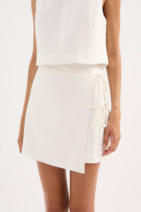 The Lotta Linen Mini Skirt in white is made from 100% linen which has been washed for a soft, breathable hand feel. The silhouette is high waisted and mini in length. Features include mock wrap front panel with yoke and double tie detail, and an invisible zipper at back. This skirt is fully lined.