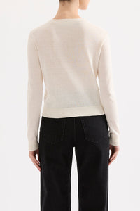 The Louie Linen Blend Cardigan is made from a lightweight yarn with a subtle marled and soft, dry hand feel. The silhouette is a relaxed crew neck cardigan finishing at hip length. Features include centre front button opening and soft rib neckline, cuffs and hem.