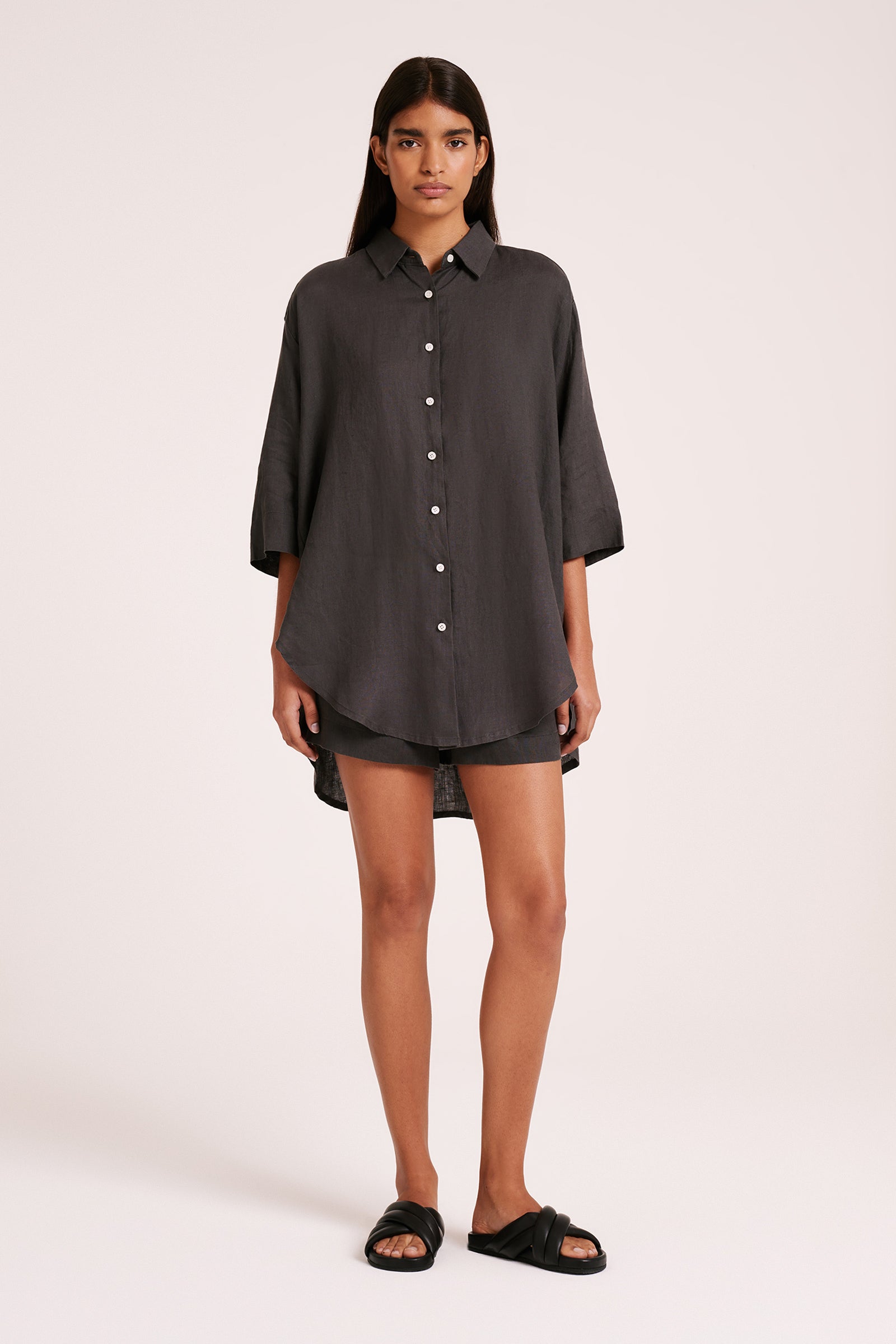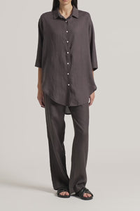 The Lounge Linen Longline Shirt is made in a premium 100% organic French linen which has been washed down for a soft and breathable handfeel. The silhouette is relaxed and oversized with a long billowing hemline and side slits. Features include classic shirt detailing with collared neckline, button front opening, 3/4 sleeves and a Nude Lucy branded label. This Longline Shirt can be worn by itself or paired with a Nude Lounge bottom.