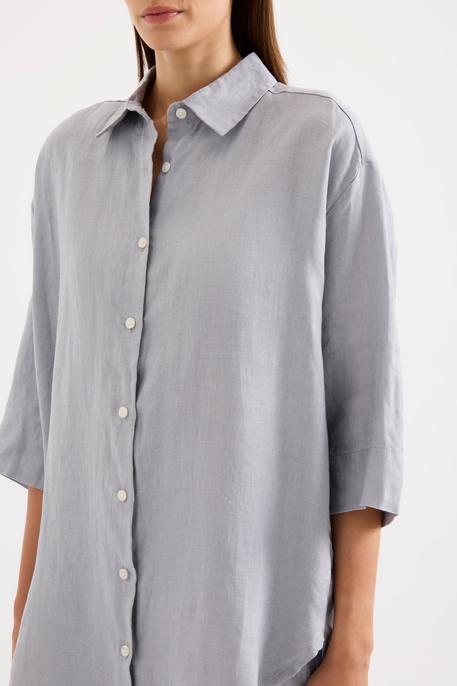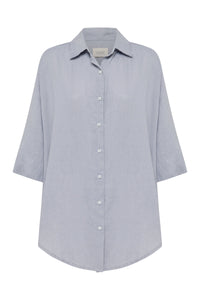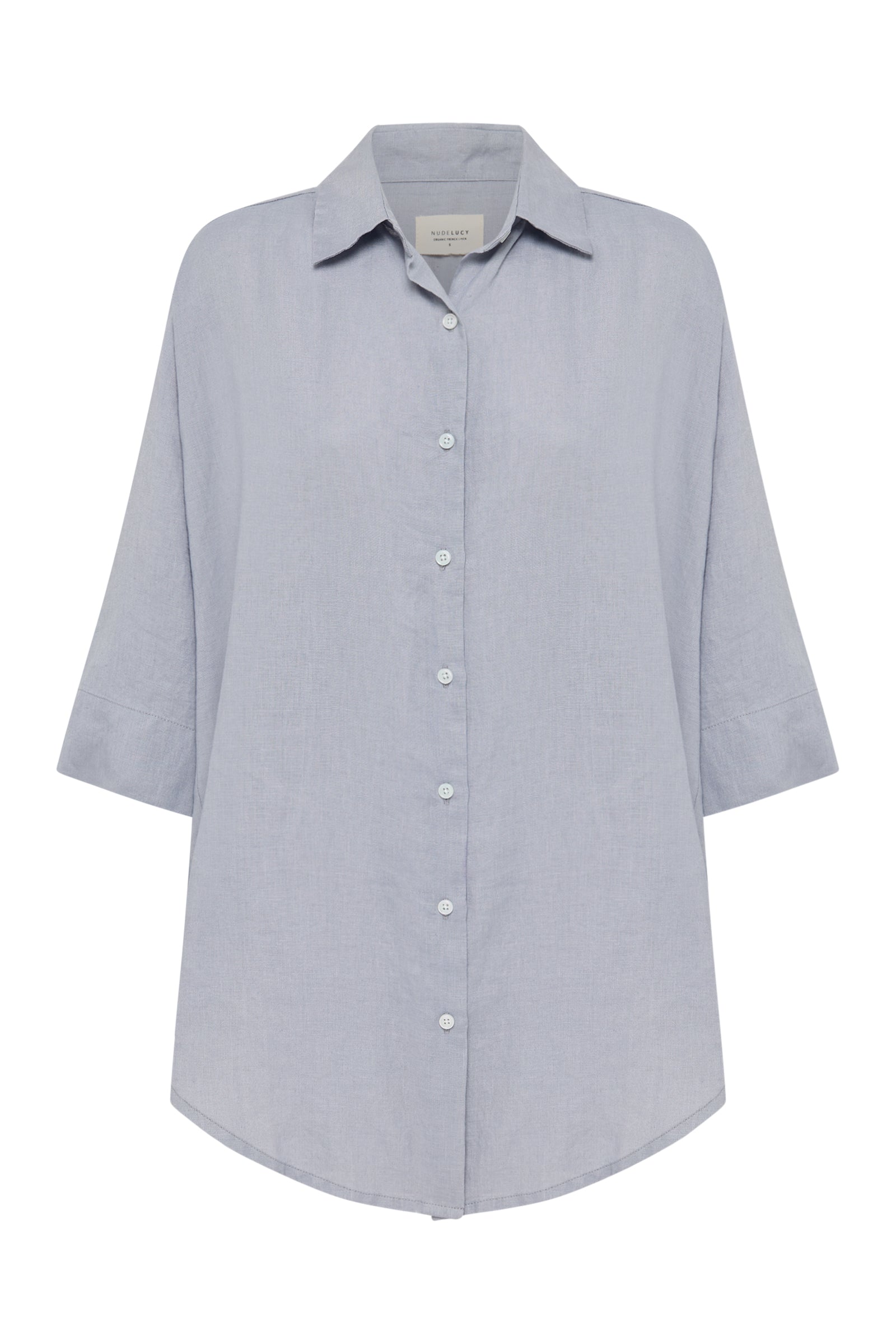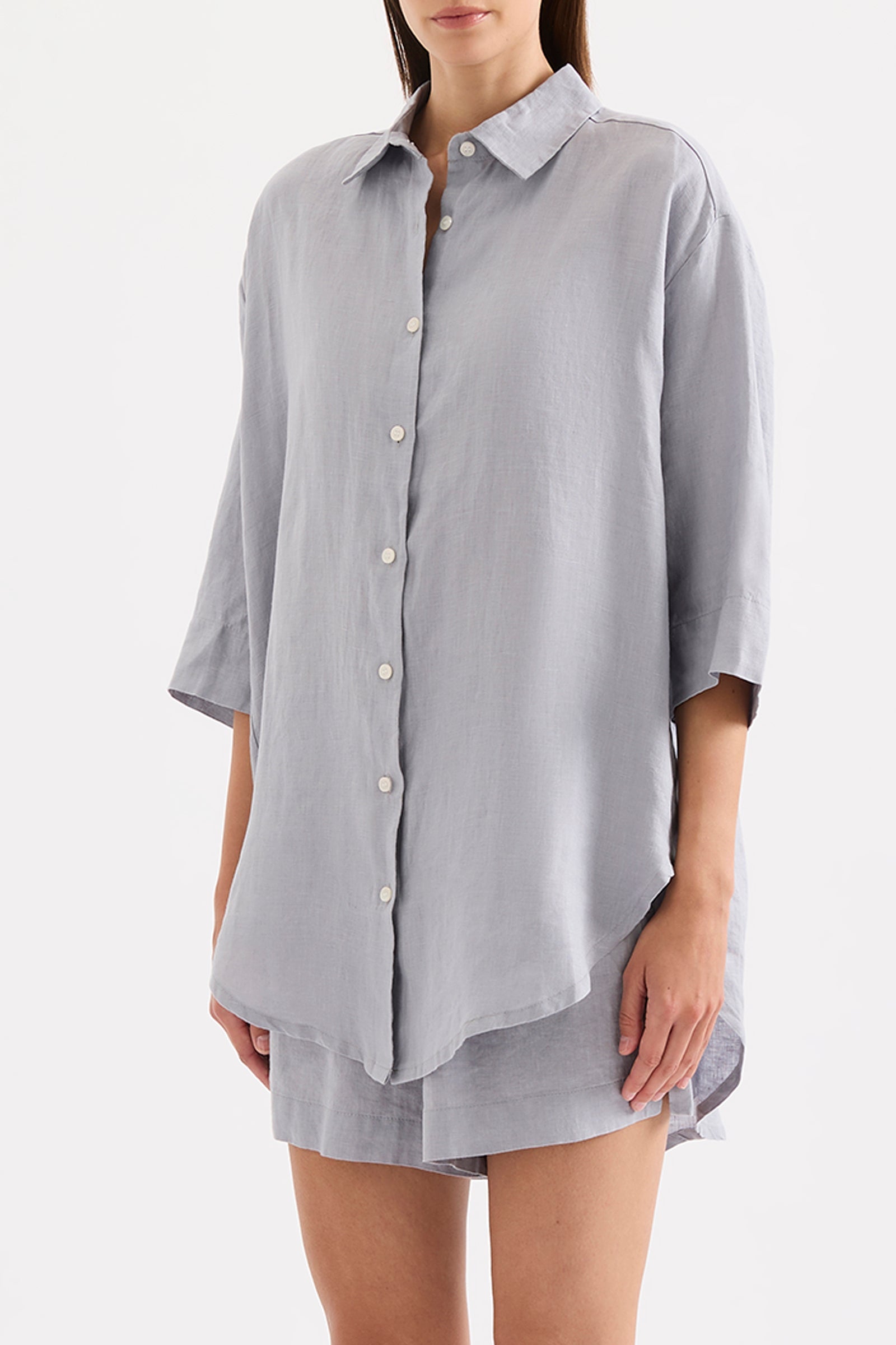 The Lounge Linen Longline Shirt is made in a premium 100% organic French linen which has been washed down for a soft and breathable handfeel. The silhouette is relaxed and oversized with a long billowing hemline and side slits. Features include classic shirt detailing with collared neckline, button front opening, 3/4 sleeves and a Nude Lucy branded label. This Longline Shirt can be worn by itself or paired with a Nude Lounge bottom.