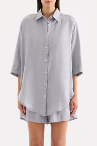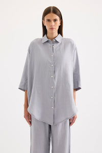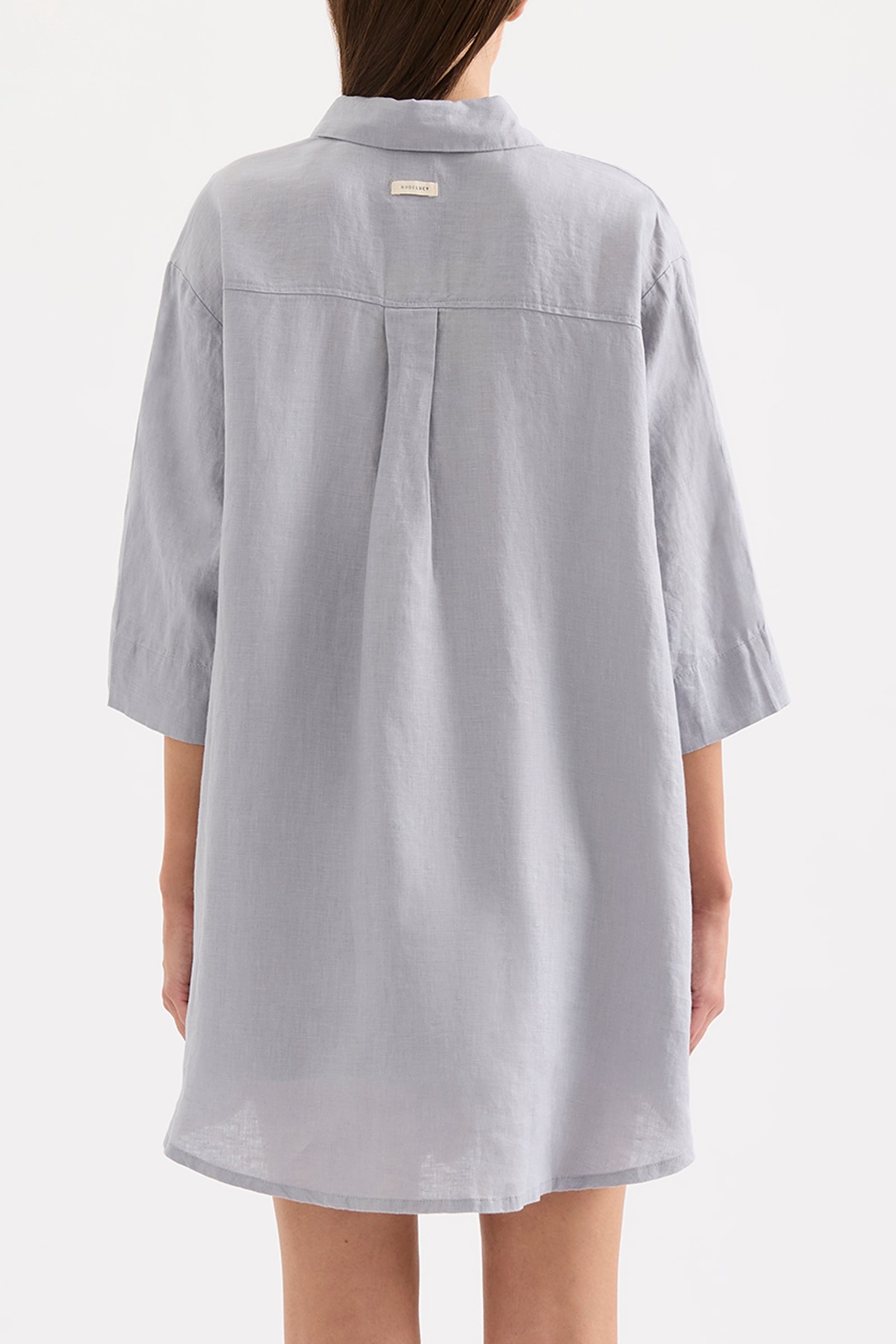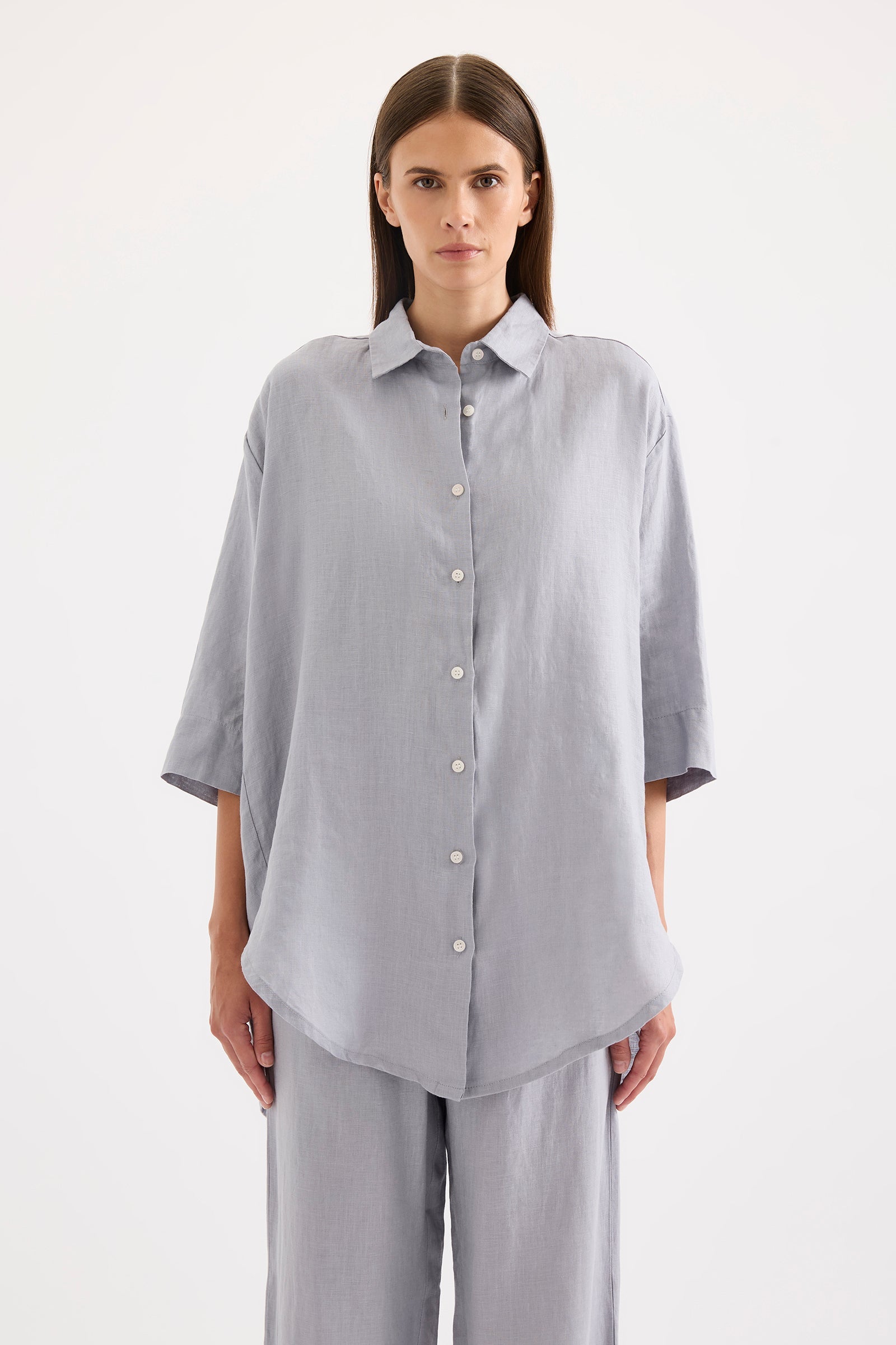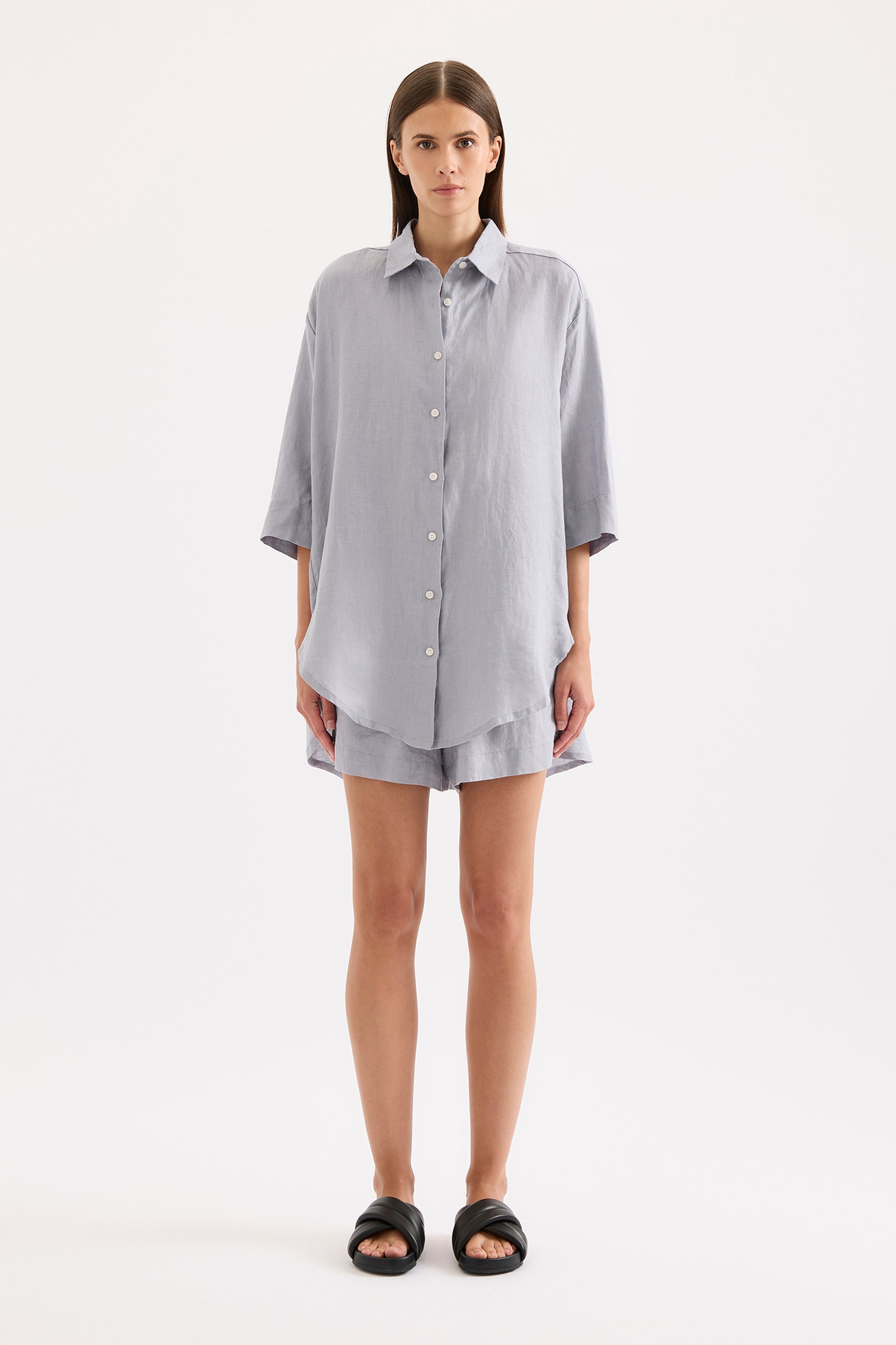 The Lounge Linen Longline Shirt is made in a premium 100% organic French linen which has been washed down for a soft and breathable handfeel. The silhouette is relaxed and oversized with a long billowing hemline and side slits. Features include classic shirt detailing with collared neckline, button front opening, 3/4 sleeves and a Nude Lucy branded label. This Longline Shirt can be worn by itself or paired with a Nude Lounge bottom.