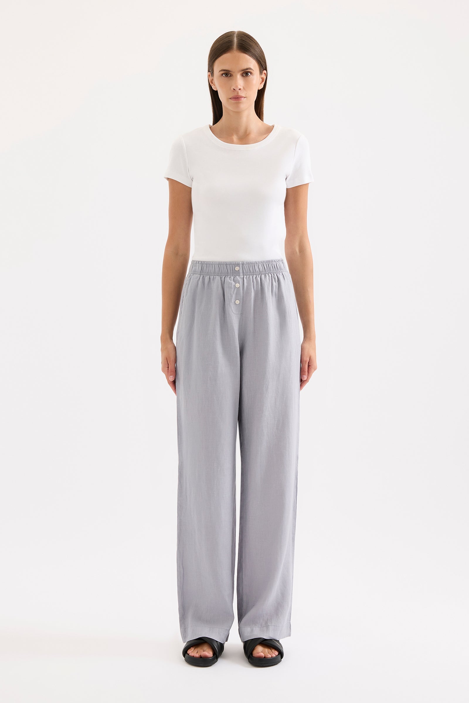 The Lounge Linen Pant is made in a premium 100% organic French linen which has been washed down for a soft and breathable hand feel. The silhouette is a clean, casual fit with a wide leg opening. Features include an elasticated waistband with a mock button front, side seam pockets and back patch pockets with Nude Lucy branded label. Pair with a Nude Lounge top in coordinating colours.