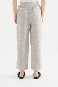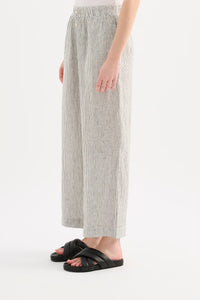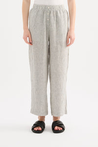 The Lounge Stripe Linen Crop Pant is made in a premium 100% organic French linen which has been washed down for a soft and breathable handfeel. The silhouette is a clean, casual fit with a wide leg opening finishing at ankle length. Features include an elasticated waistband with a mock button front, side seam pockets and back patch pockets with Nude Lucy branded label. Pair with a Nude Lounge top in coordinating colours.