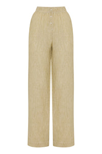The Lounge Stripe Linen Pant is made in a premium 100% organic French linen which has been washed down for a soft and breathable hand feel and features an exclusive yarn dyed stripe. The silhouette is a clean, casual fit with a wide leg opening. Features include an elasticated waistband with a mock button front, side seam pockets and back patch pockets with Nude Lucy branded label. Pair with a Nude Lounge top in coordinating colours.