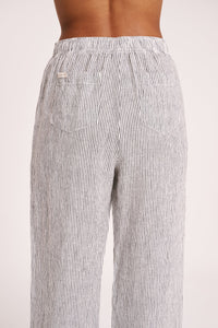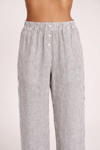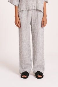The Lounge Stripe Linen Pant is made in a premium 100% organic French linen which has been washed down for a soft and breathable hand feel and features an exclusive yarn dyed stripe. The silhouette is a clean, casual fit with a wide leg opening. Features include an elasticated waistband with a mock button front, side seam pockets and back patch pockets with Nude Lucy branded label. Pair with a Nude Lounge top in coordinating colours.