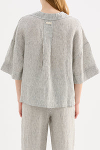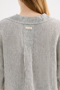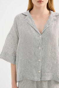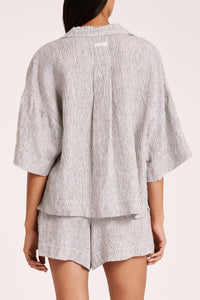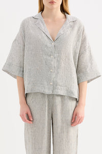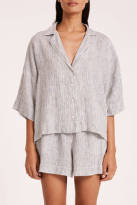 The Lounge Linen Shirt is made in a premium 100% organic French linen which has been washed down for a soft and breathable hand feel and features an exclusive yarn dyed stripe.. The silhouette is a classic shape, with a clean and casual fit. Features include a wide collared neckline, button front opening and wide elbow length sleeves. This shirt also includes the Nude Lucy branded label. Pair with a Nude Lounge Bottom in coordinating colours.