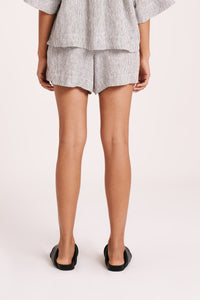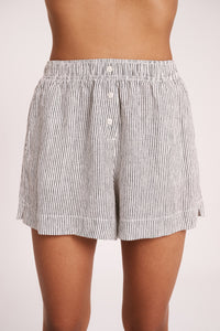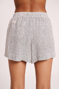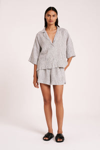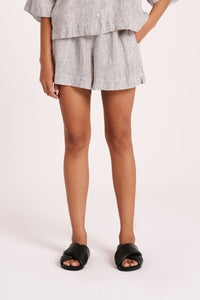 The Lounge Stripe Linen Short is made in a premium 100% organic French linen which has been washed down for a soft and breathable hand feel and features an exclusive yarn dyed stripe. The silhouette is a clean casual fit with a wide leg opening. Features include an elasticated waistband with a mock button front, side seam pockets and back patch pockets with a Nude Lucy branded label. Pair with a Nude Lounge top in coordinating colours.