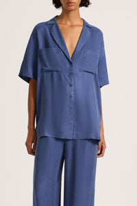 The Lucia Cupro Shirt in indigo is made in our signature cupro fabrication, with a soft, velvety hand feel. The silhouette is an oversized fit, with length finishing at the hip. Features include classic shirting details with front pocket and shell buttons.