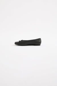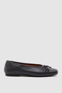 The Lucien Ballet Flat is a slip on style shoe made from smooth upper leather. Features include rounded square toe cap and bow on top of shoe.