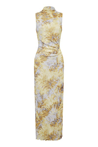 The Lumine Mesh Dress is made from a stretch jersey in our exclusive Lumine print. The silhouette is form fitting with length finishing above the ankles. Features include a raised neckline with soft gathering detail, asymmetric seam detail and ruching at the waist. This dress is fully lined.