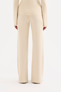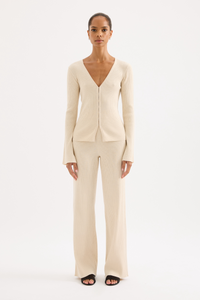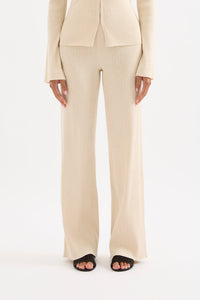 The Malo Knit Pant is made from a cotton blend yarn that is breathable and has a ribbed finish. The silhouette is a high rise, full length pant with a flared leg opening. Features include an elasticated waistband.