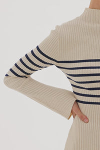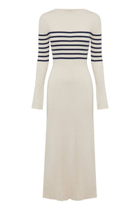 The Misha Knit Maxi Dress is made from a lightweight cotton blend yarn which is soft on the skin. The silhouette is form fitting with long flared sleeves and length finishing above the ankles. Features include a crew neckline and placement stripe.