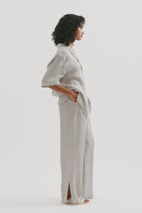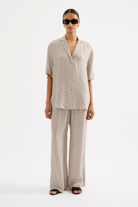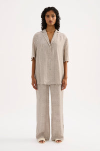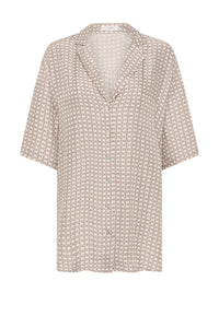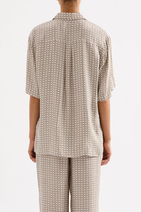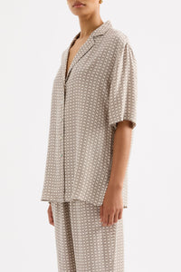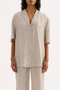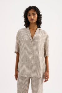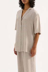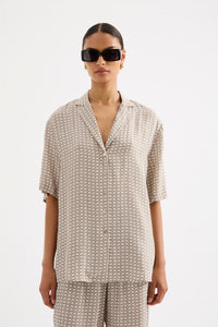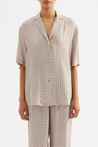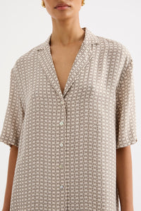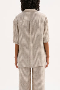 The Moneta Cupro Shirt is made in our signature cupro fabrication in our exclusive Moneta print. The silhouette is an oversized fit, with length finishing at the hip. Features include classic shirting details with back yoke and pearl buttons.