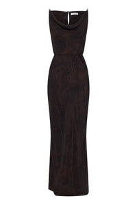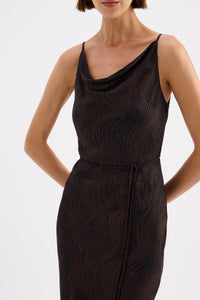 The Onda Cupro Maxi Dress is crafted from a premium cupro fabrication in our exclusive Onda print. This maxi length dress has a soft, sueded hand feel and is cut on a bias for a flattering shape. Features include high cowl neckline, tie at waist and side seam slits.