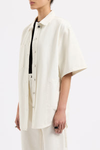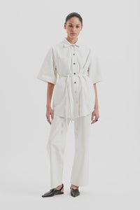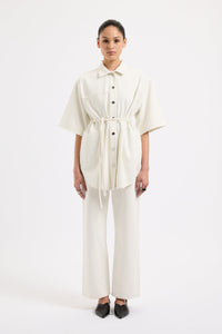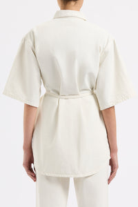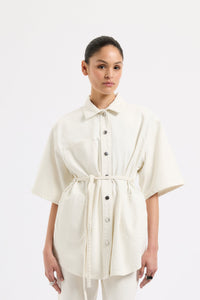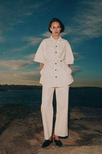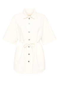 The Organic Denim Shacket is made from our 12 oz 100% organic cotton denim. The silhouette is an oversized, boxy fit with half sleeves finishing just past the elbow. Features include Nude Lucy branded shanks, side pockets and tie at waist.