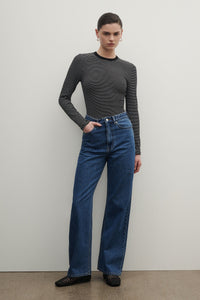 The Organic Stripe Rib LS Tee by Nude Lucy is a key piece to add to your basics wardrobe range. Made in organic cotton the silhouette is a flattering close fit with length finishing at the hip. Features include a crew neck and long fitted sleeves. This can be tucked in or worn over midrise bottoms.