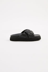 The Oscar Slide is made from premium 100% sheep leather upper, grounded on a solid rubber base. Features include twisted straps with woven detail and a platform sole with arched shaping for extra support and comfort.
