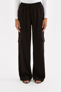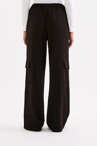 The Quincy Cargo Pant is made from a lightweight tailoring fabric. The silhouette is relaxed with a wide full length leg. Features include an elasticated waistband with an external draw cord, cargo pockets, and side seam pockets.