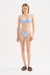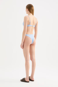 The Rib Cheeky Brief is made from a premium recycled stretch fabrication with a soft hand feel and wide rib. The bottom has a low rise and high leg that can be pulled up or down. This bottom is fully lined with cheeky back coverage.