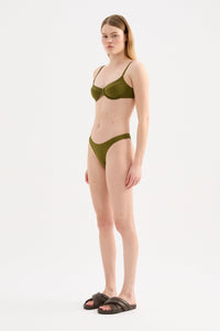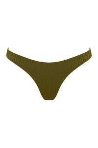 The Rib Cheeky Brief is made from a premium recycled stretch fabrication with a soft hand feel and wide rib. The bottom has a low rise and high leg that can be pulled up or down. This bottom is fully lined with cheeky back coverage.