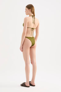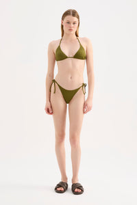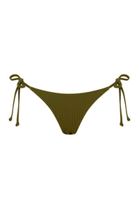 The Rib String Bikini Brief is made from a premium recycled stretch fabrication with a soft hand feel and wide rib finish. The bottom is fully lined and features a classic cut with adjustable tie sides. Moderate back coverage.