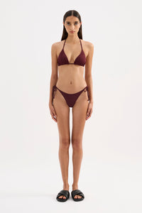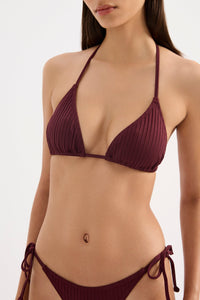 The Rib Triangle Top is made from a premium recycled stretch fabrication with a soft hand feel and wide rib finish. The top has a soft tri cup bust and thin elasticated halter straps. Features include adjustable neck and body.