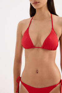 The Rib Triangle Top is made from a premium recycled stretch fabrication with a soft hand feel and wide rib finish. The top has a soft tri cup bust and thin elasticated halter straps. Features include adjustable neck and body.