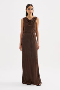 The Serine Maxi Dress is made from a viscose blend fabric which is lightweight and has a soft, textured hand feel. Cut on the bias, this silhouette drapes over the body softly and finishes above the ankles. Features include a soft cowl neckline, tie at waist and side seam slits.