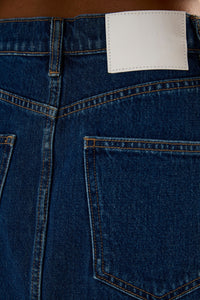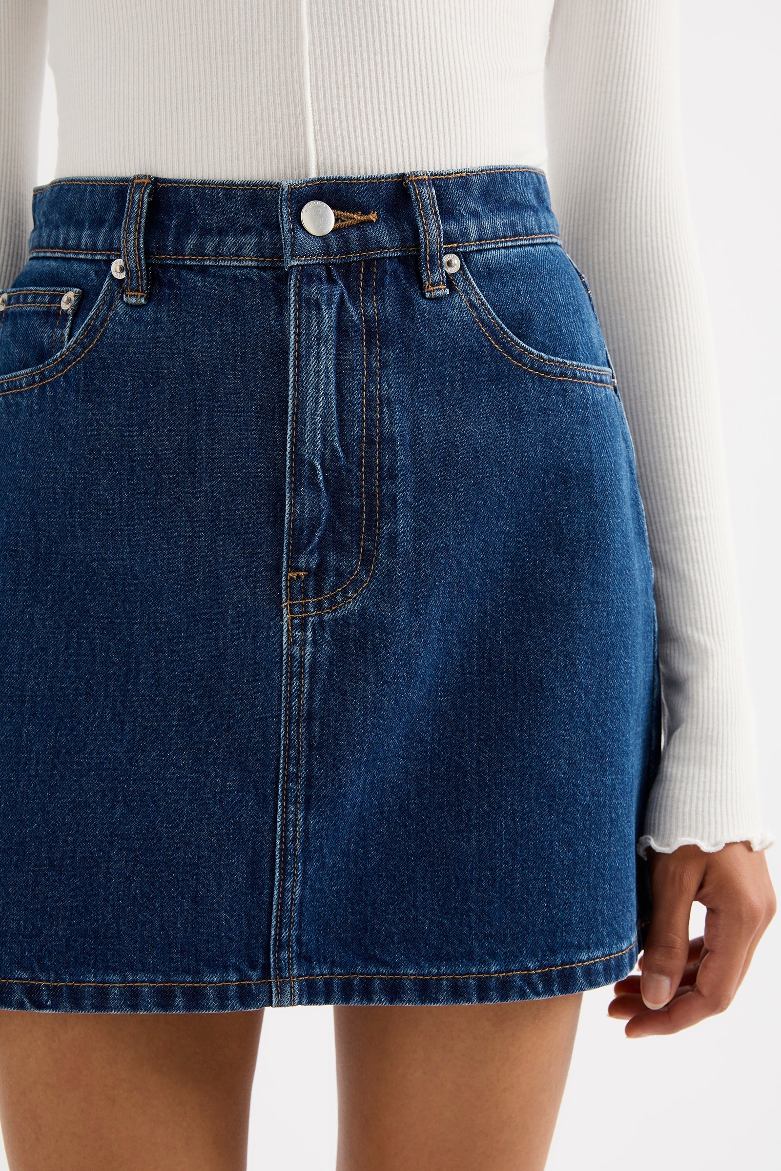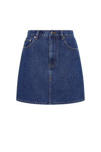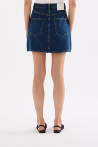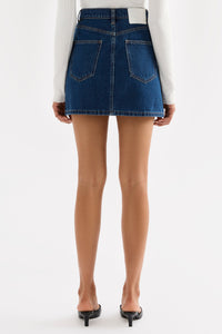 The Sia Denim Mini Skirt is made from our 12 oz 100% organic cotton denim with a Force Blue stone wash. The silhouette is mid to high rise. Features include branded shank button, rivets & Jacron Back patch. Style is mini in length. Fits true to size, size up for a more relaxed fit.