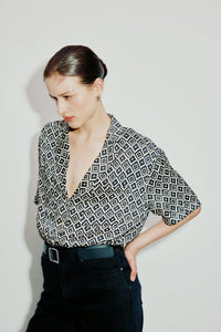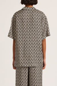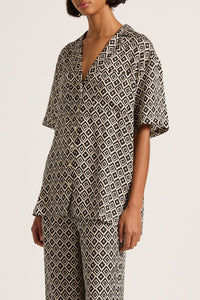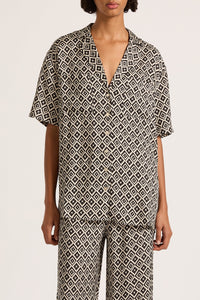 The Simone Shirt is made from a lyocell blend fabrication in our exclusive Daiya print. The silhouette is an oversized fit, with length finishing at the hip. Features include classic shirting details with front pocket and shell buttons.