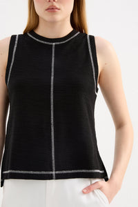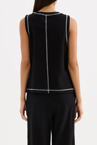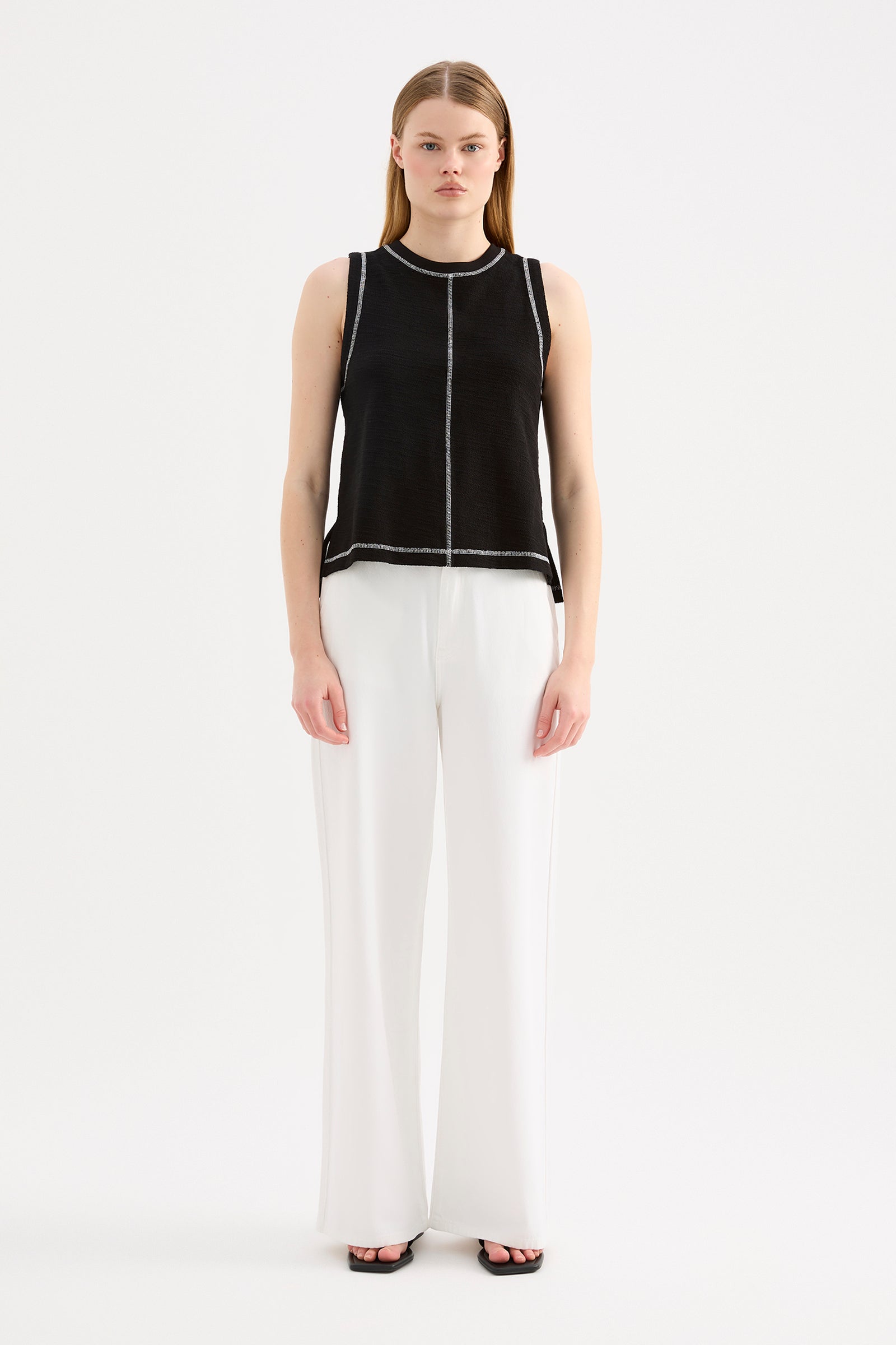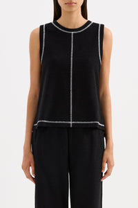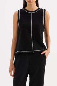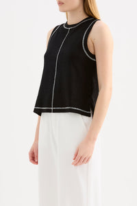 The Sutton Tank is made from a textured cotton fabrication that is soft on the skin. The silhouette is a boxy fit tank finishing at the hip. Features include a crew neckline, stepped hem with side slits and contrast stitching detail.