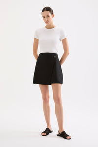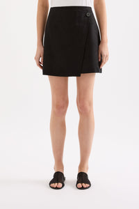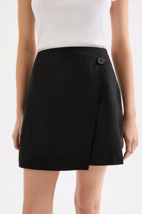 The Thilda Linen Mini Skirt in white is made from 100% linen which has been washed for a soft, breathable hand feel. The silhouette is high waisted and mini in length. Features include mock wrap front panel, mock shell button and invisible zipper at back. This skirt is fully lined.